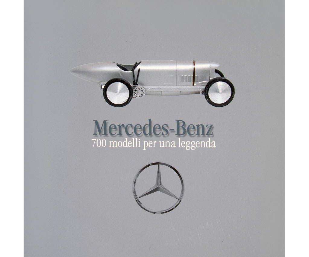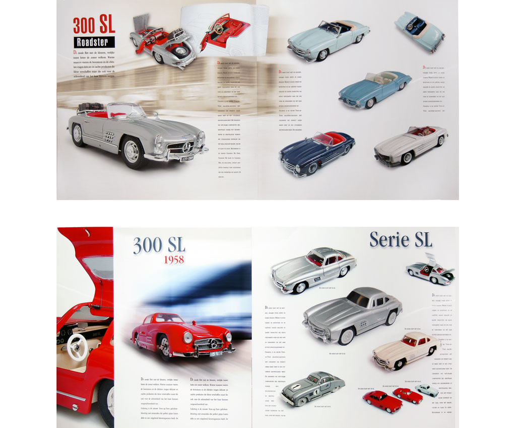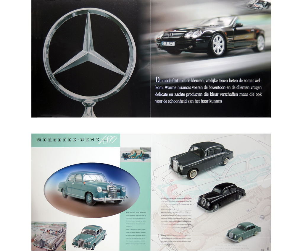 Una brochure per celebrare la cronistoria delle automobili Mercedes-Benz con immagini di modellini in scala fotografati con movimento simulato, posati su cataloghi d’epoca originali e descritti anche nei particolari.