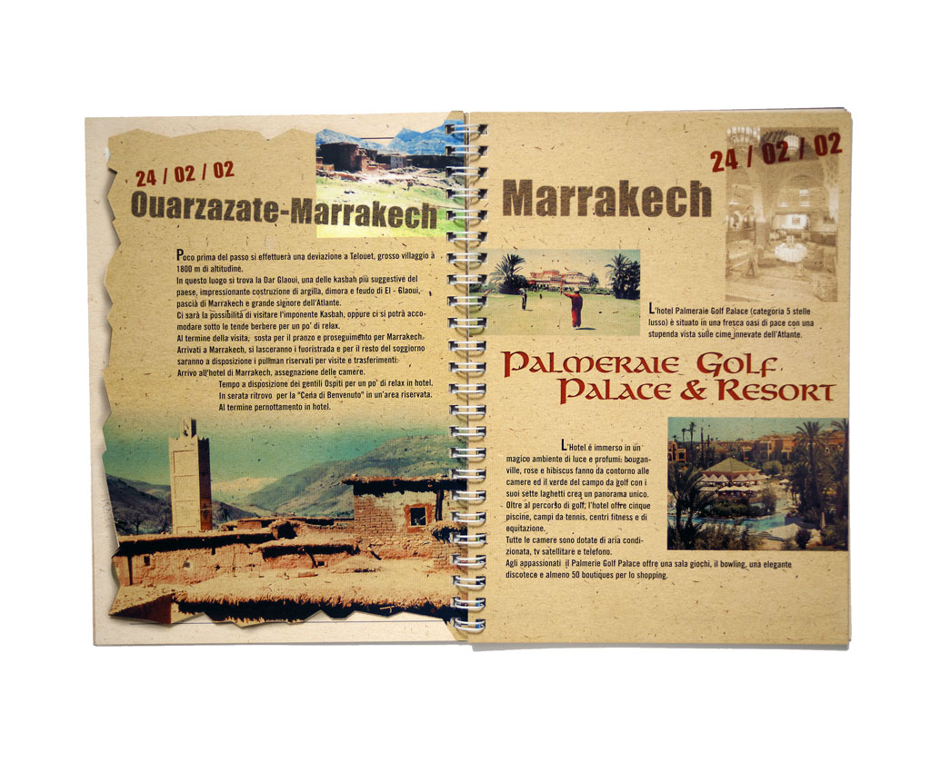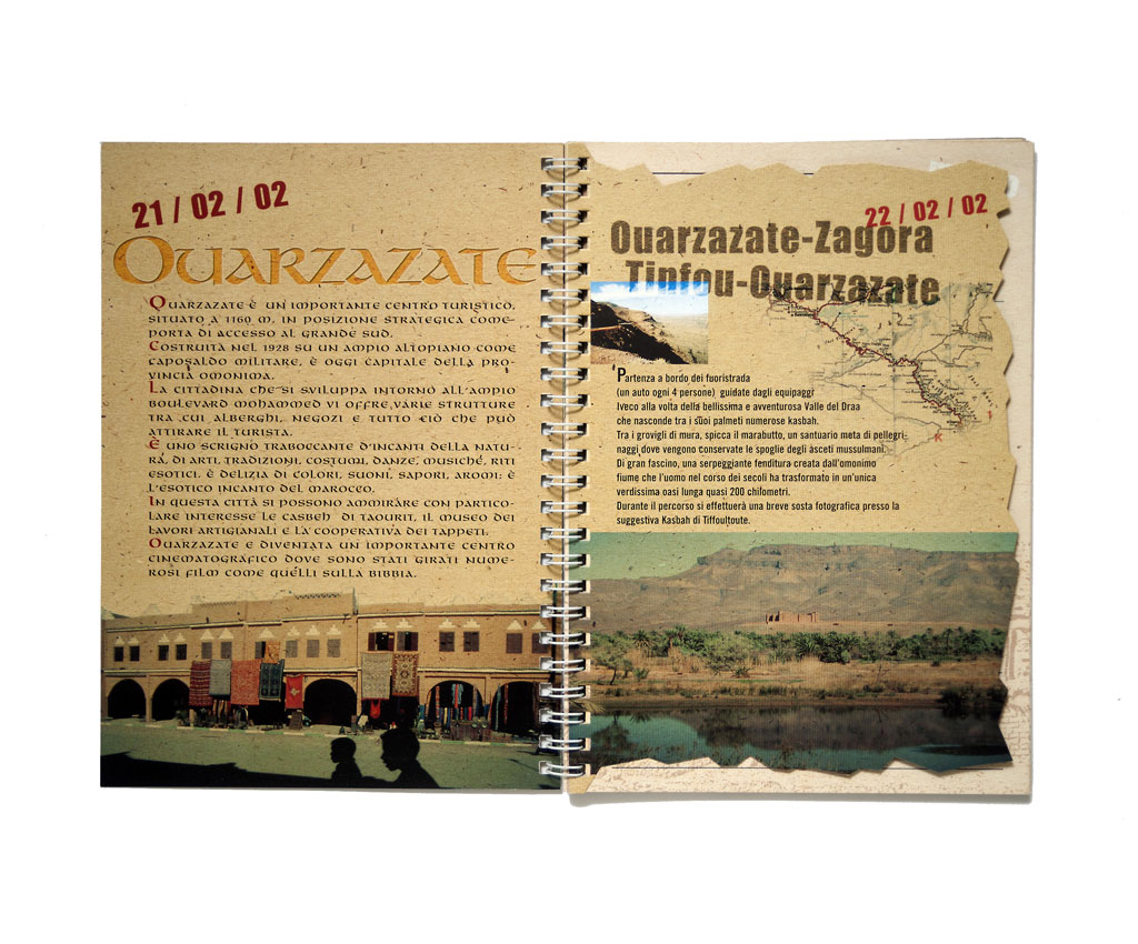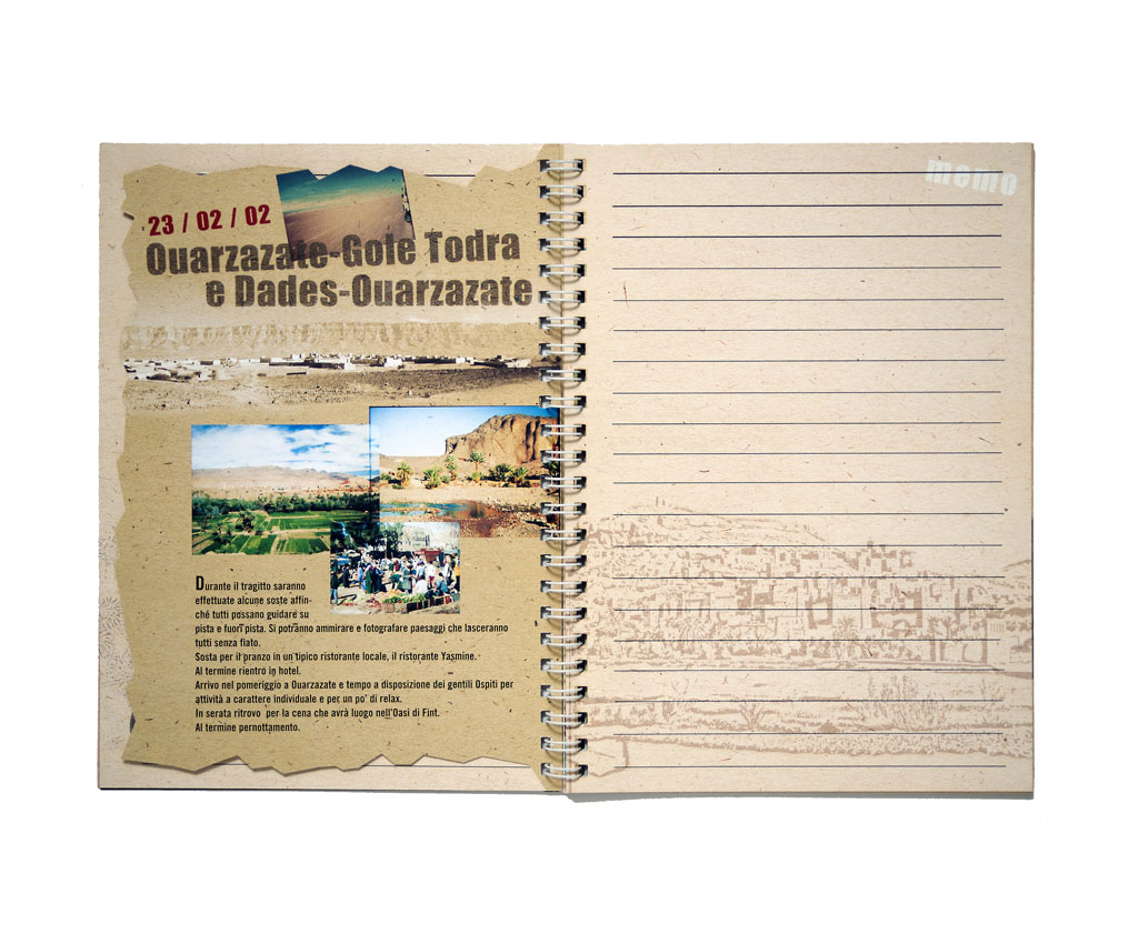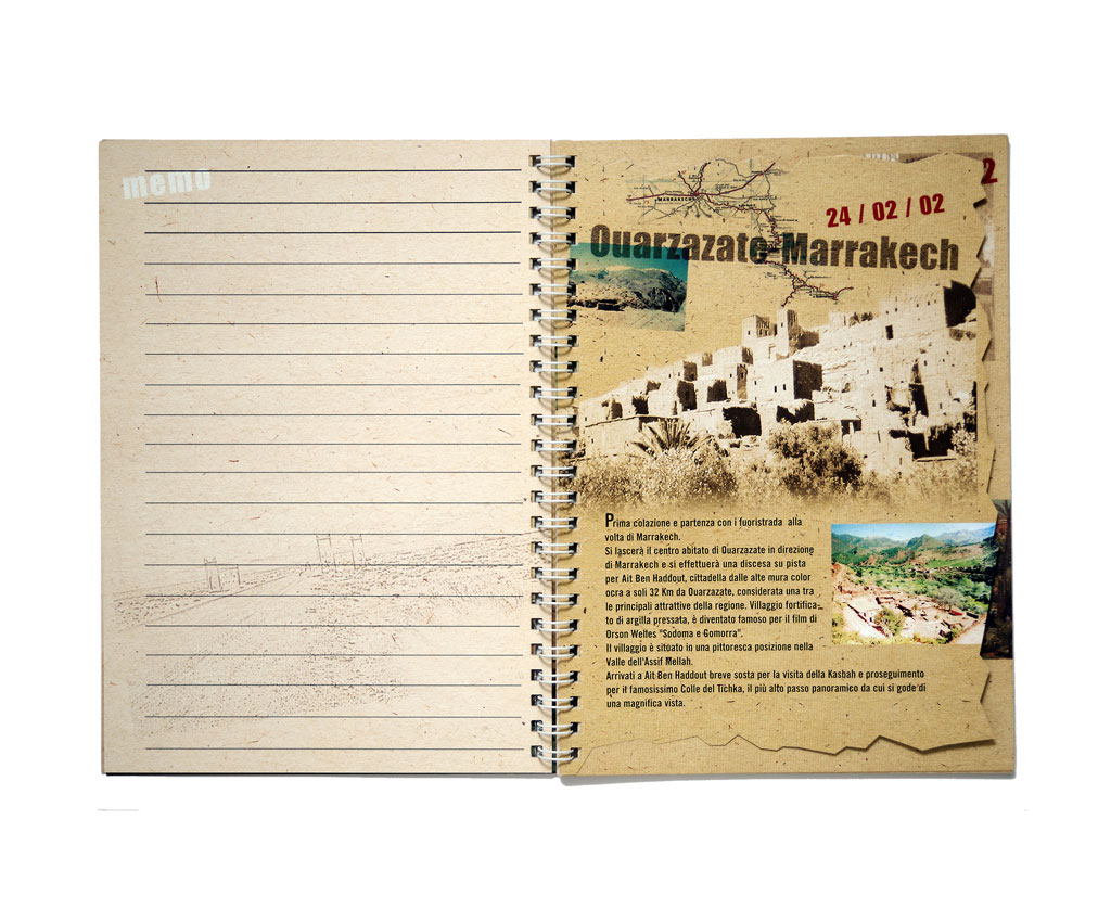 Per i partecipanti ad un viaggio promozionale, l’idea è stata di creare una specie di “diario di bordo” contenente sia il programma giornaliero che pagine libere per appunti personali. La grafica crea l’aspettativa per un tour avventuroso e le fotografie le avevo, per fortunata combinazione, scattate anni prima durante una vacanza.