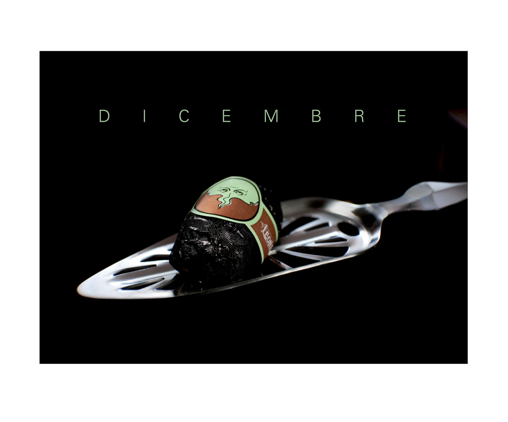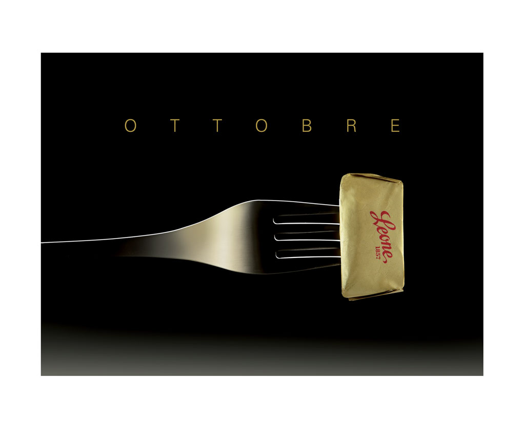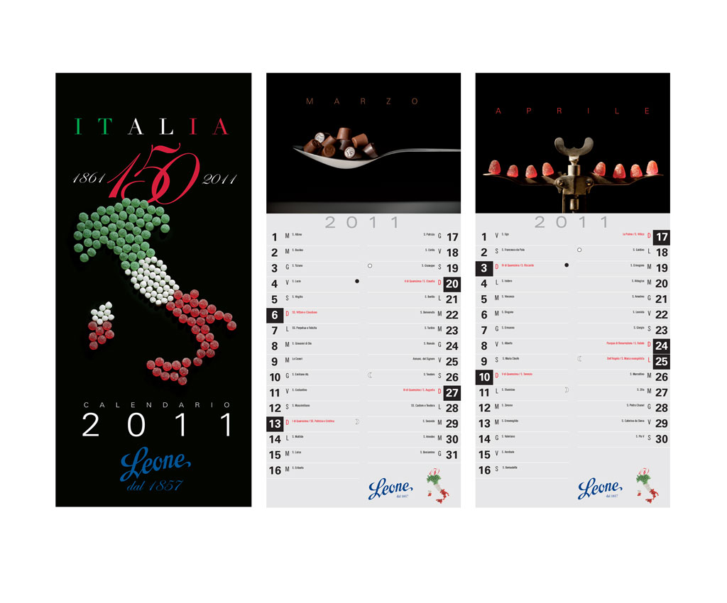La copertina celebra i Centocinquant’anni anni dell’Unità d’Italia mentre nelle altre immagini i prodotti Leone, anziché in pasticceria, entrano in cucina a giocare con gli attrezzi del mestiere.