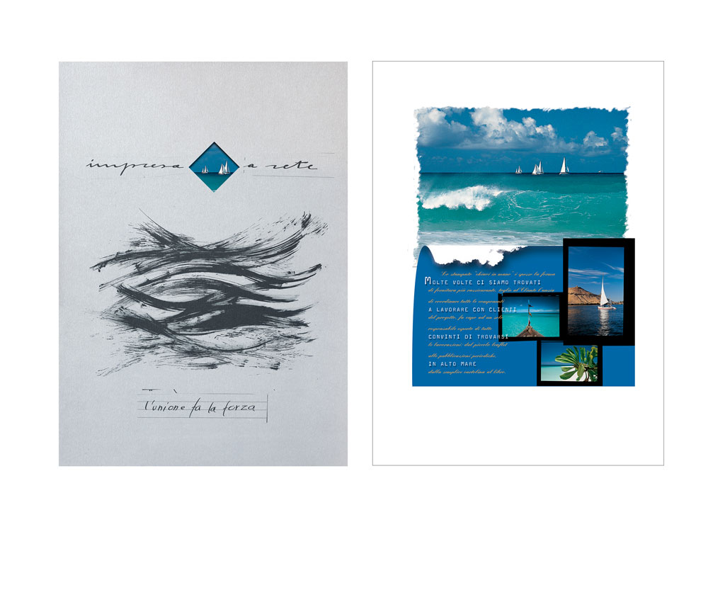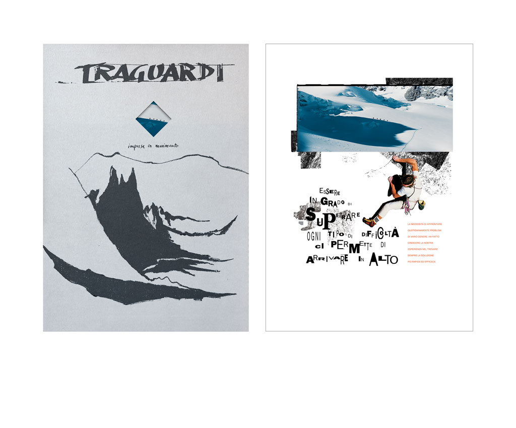 creazione del logo, copy, grafica e fotografia. Ogni argomento si apre con una pagina di presentazione su cartoncino argento fustellato con una finestra a rombo che si rifà al logo e introduce l’immagine successiva.